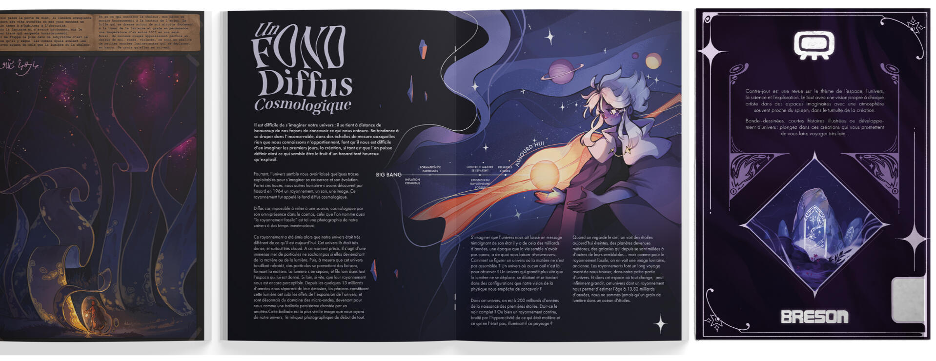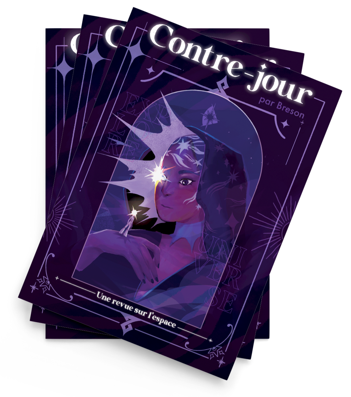 Contre-jour est une revue sur le thème de l’espace, l’univers, la science et l’exploration, le tout avec une vision propre à chaque artiste avec une atmosphère souvent proche du spleen, dans le tumulte de la création.Magazine réunissant le travail de 16 artistes, il regroupe des articles, illustrations, courtes histoires ... Ce fanzine a été financé par un crowdfunding au mois de février 2024.