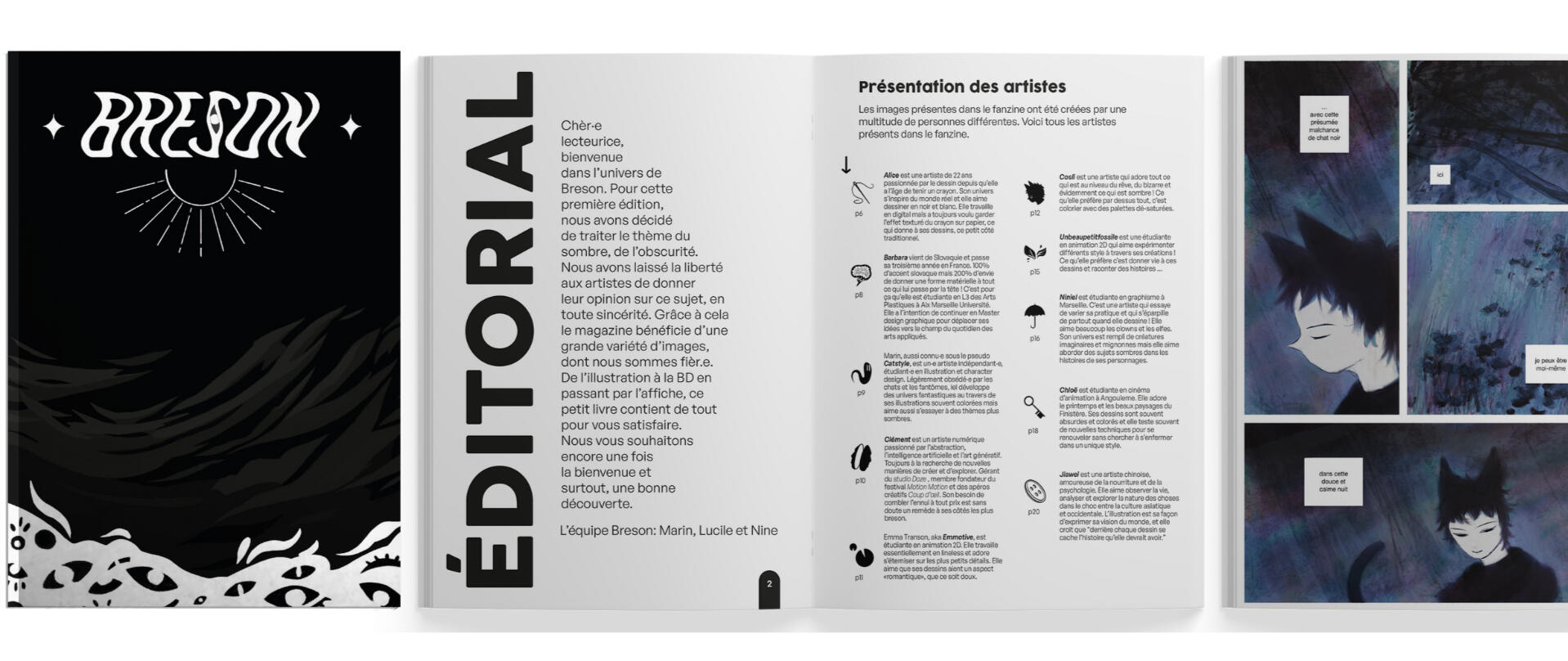 En 2022, alors que Breson n'existait pas encore officiellement en tant qu'association, nous avons produit notre premier fanzine, devenu ensuite le nom de l'association, Breson.Breson c'est un fanzine réunissant 27 artistes visitant l'obscurité et ses sombres méandres au travers de diverses créations.