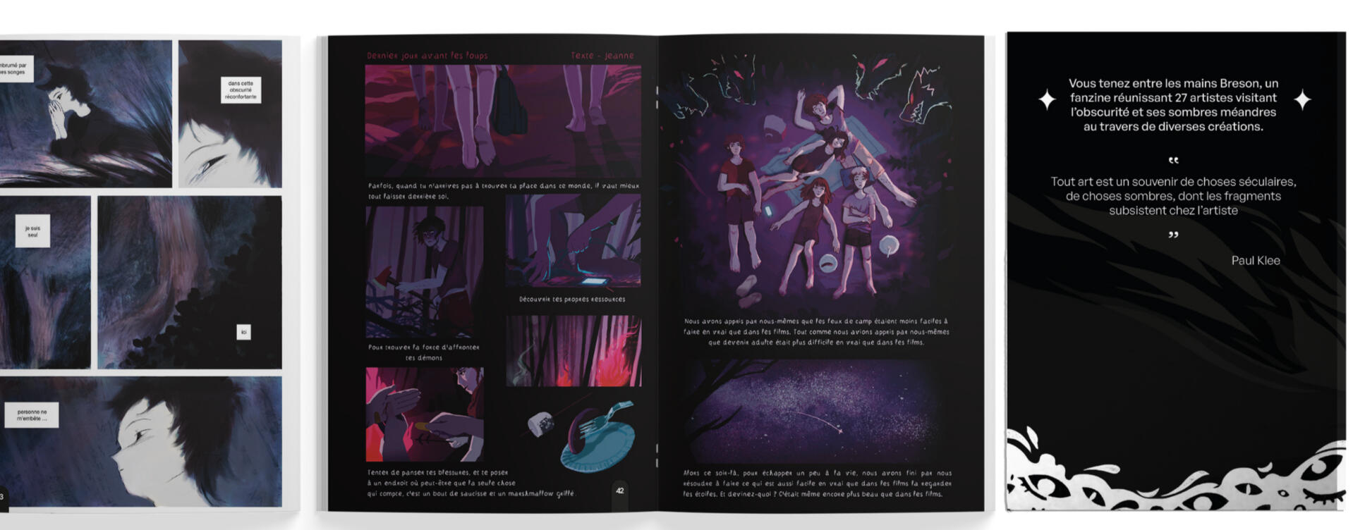 Breson, c'est un fanzine édité en 2022 réunissant diverses créations de 27 artistes visitant l'obscurité et ses sombres méandres.